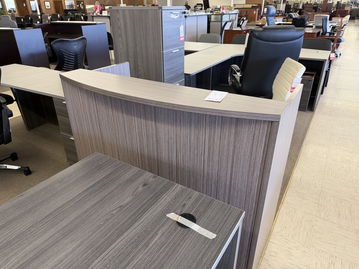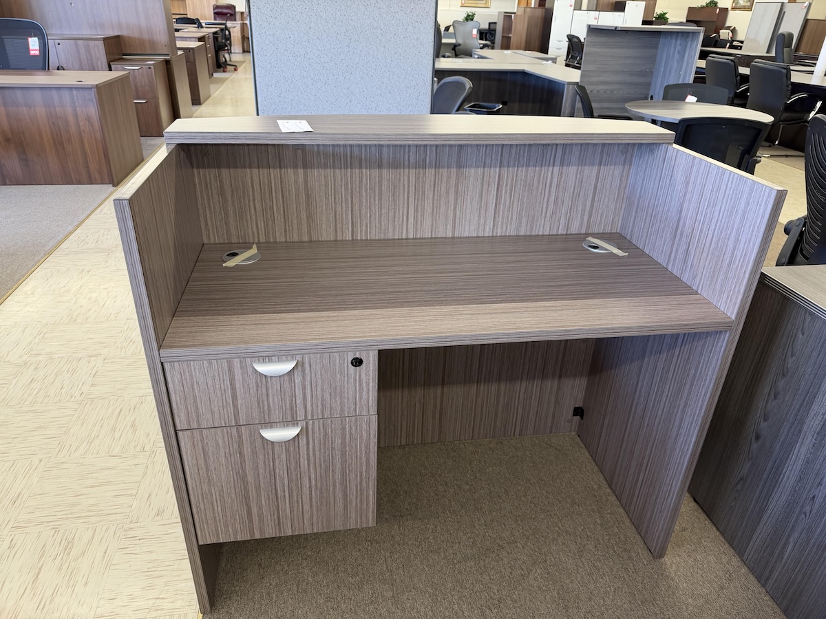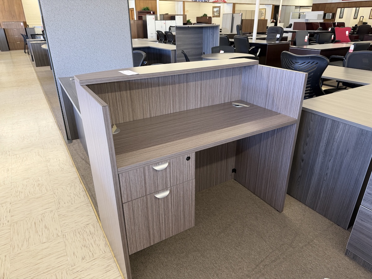 48W x 25.5/20.5D x 41.5H inch Reception Desk Shell in light, neutral Driftwood featuring Beige tones. It can be used alone or in conjunction with other reception items (sold separately). Durable and attractive, this reception desk shell promotes a sense of elegance and makes for a great first impression. It is constructed of thermal fused melamine with 3mm PVC edge banding, which offer excellent durability and scratch resistance. It comes with a 1 inch thick table top that provides a sturdy surface that will require little maintenance. It is also equipped with leveling glides that offer exceptional balance on different floor surfaces. The cam lock construction makes for easy assembly, and provides secure fastening without affecting the outward appearance of the desk. The full length modesty panel offers full coverage and privacy. The 3 inch round grommets on all work surfaces make for easy cable and wire management, and are compatible with the BOSS power grommets (sold separately).