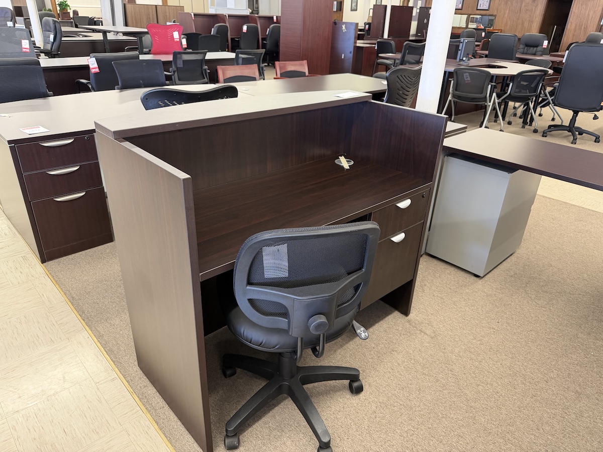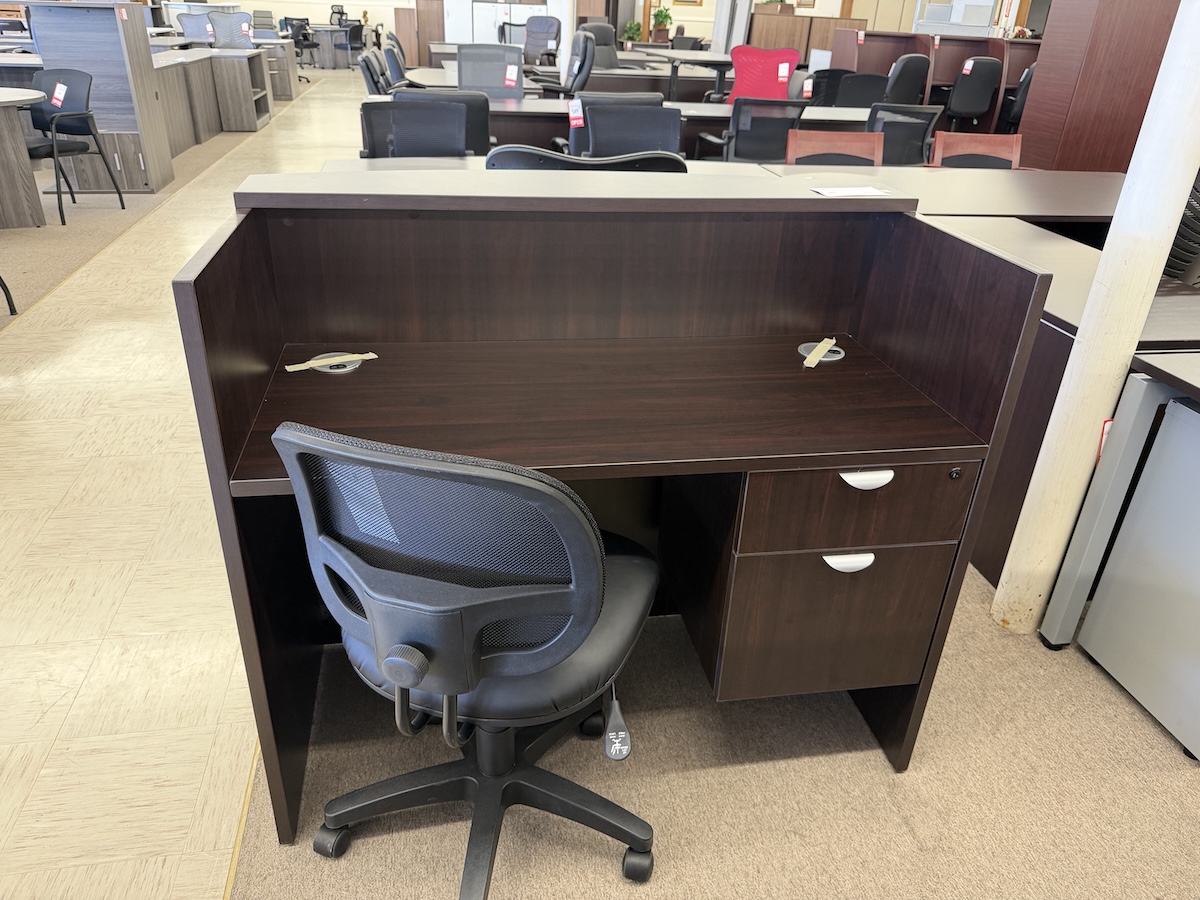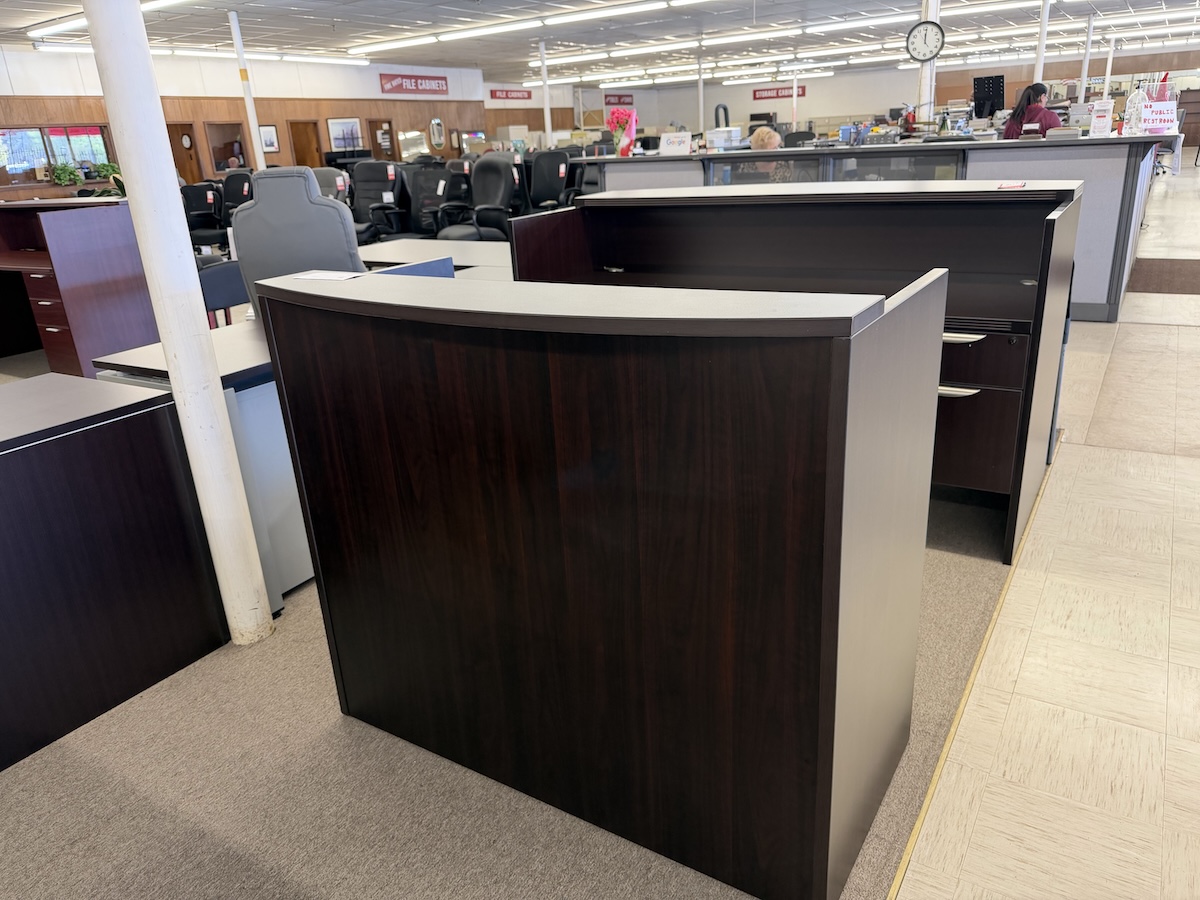 48W x 25.5/20.5D x 41.5H inch Reception Desk Shell in light, neutral Driftwood featuring Beige tones. It can be used alone or in conjunction with other reception items (sold separately). Durable and attractive, this reception desk shell promotes a sense of elegance and makes for a great first impression. It is constructed of thermal fused melamine with 3mm PVC edge banding, which offer excellent durability and scratch resistance. It comes with a 1 inch thick table top that provides a sturdy surface that will require little maintenance. It is also equipped with leveling glides that offer exceptional balance on different floor surfaces. The cam lock construction makes for easy assembly, and provides secure fastening without affecting the outward appearance of the desk. The full length modesty panel offers full coverage and privacy. The 3 inch round grommets on all work surfaces make for easy cable and wire management, and are compatible with the BOSS power grommets (sold separately).